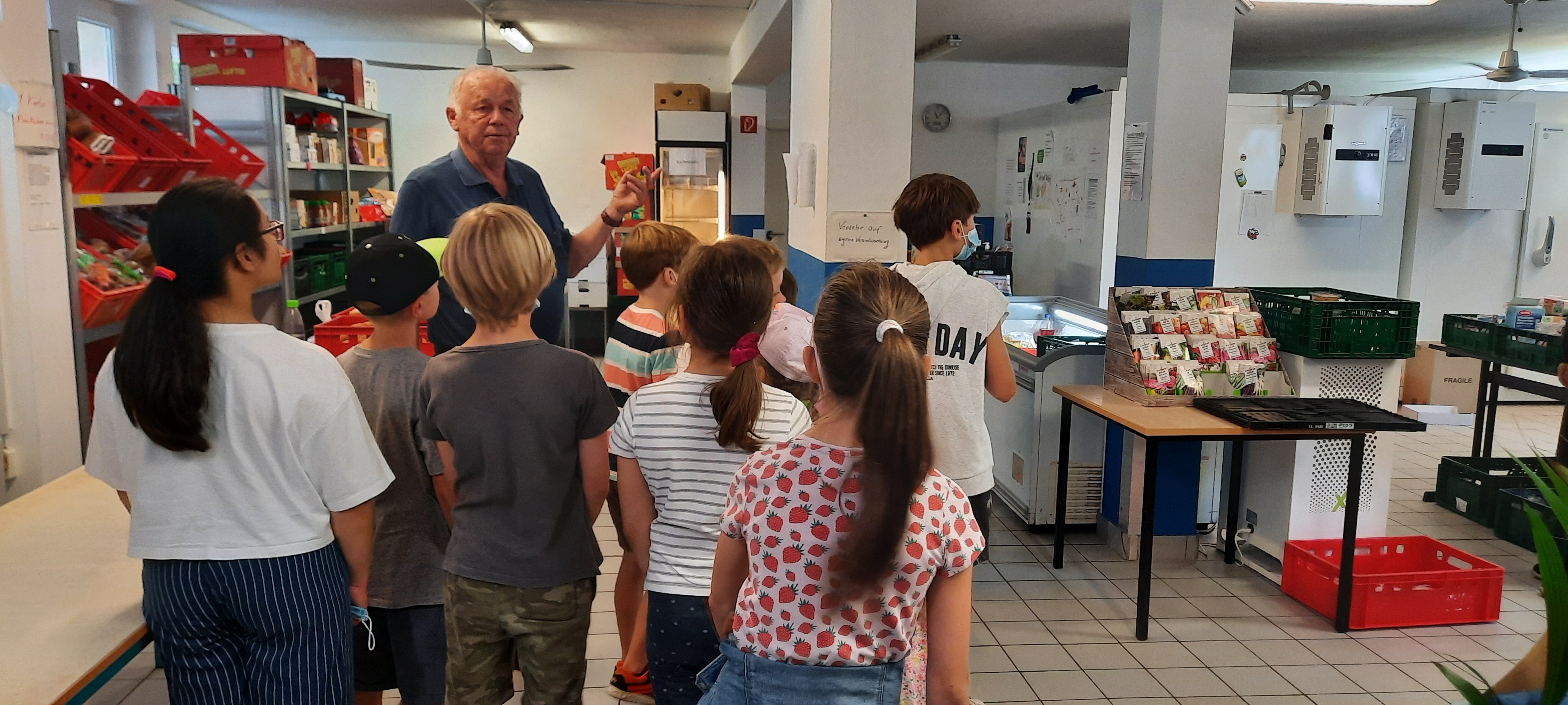Der Vorstandsvorsitzende Herr Schramm empfing uns sehr freundlich im Tafelhaus in Jena Lobeda. Bei der Gelegenheit durften wir uns auch umsehen. In der Sortierung werden die frischen und haltbaren Speisen vorsortiert und geprüft. Schließlich landet alles in großen Regalen – ganz wie in einem Supermarkt. Auch Knabberzeug, Süßes und Ketchup haben wir entdeckt.